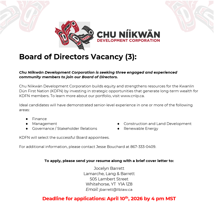 Chu Niikwan largely operates in Whitehorse, the capital of the Yukon. Whitehorse is an expanding economic hub serving the territory, northern BC and Alaska. Fueled by the demands of a thriving mining industry, a steady stream of tourists and a growing population, one of the highest in Canada over the last few years. Whitehorse is well positioned for business, investment and residential development opportunities.